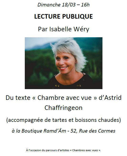 dimanche 18 mars, 16h : lecture-performance par Isabelle Wéry en présence de l'auteure et de l'artiste