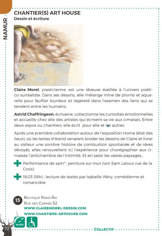 Dans le cadre du parcours d'artistes de Namur CHAMBRES AVEC VUE, la nouvelle publication d'EdL, CHAMBRE AVEC VUE d'Astrid Chaffringeon, illustrée par Claire Morel, sera présentée à la librairie Ramd'Âm, 52 rue des Carmes - 5000 NAMUR